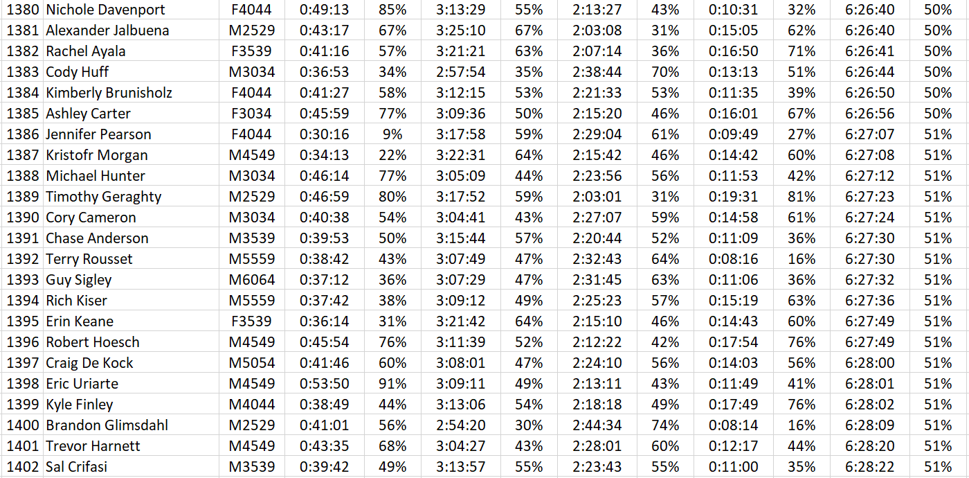 Basically, like we do for all Utah Triathlon Championship Series races, we crunch some #'s to show your percentile vs. the field for each discipline. The lower % the better, and this look helps you track your own performance year over year, race to race. Here is the same analysis for 2017-19 if you want to look at St. George across multiple years: