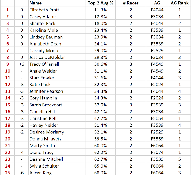 * We use your Overall % to calculate the rankings (which is shown in all the individual race “Results Breakdowns” we post). This is simply how you placed vs. the field - if you placed 60th out of 100 at a race, that’s 60%. If you placed 80th out of 200 at another, that’s 40%. In this case those two then average to 50%.